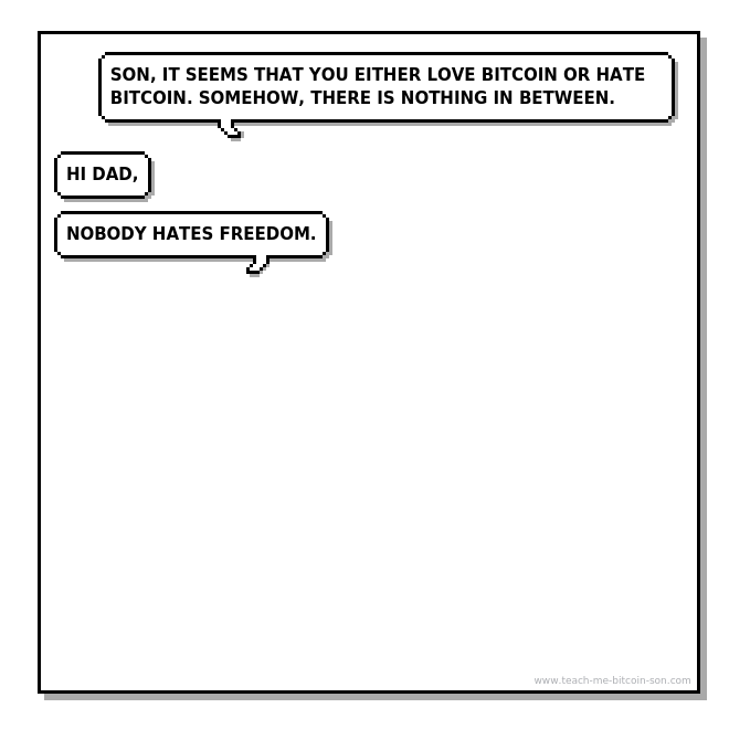 Dad: Son, it seems that you either love Bitcoin or hate Bitcoin. Somehow, there is nothing in between.