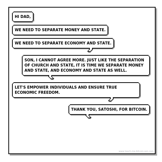Dad: Son, I cannot agree more. Just like the separation of church and state, it is time we separate money and state, and economy and state as well.
