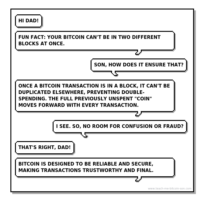 Son: Once a Bitcoin transaction is in a block, it can't be duplicated elsewhere, preventing double-spending. The full previously unspent "coin" moves forward with every transaction.