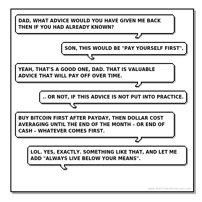 Son: Buy bitcoin first after payday, then dollar cost averaging until the end of the month – or end of cash – whatever comes first.