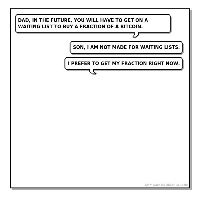 Son: Dad, in the future, you will have to get on a waiting list to buy a fraction of a bitcoin.