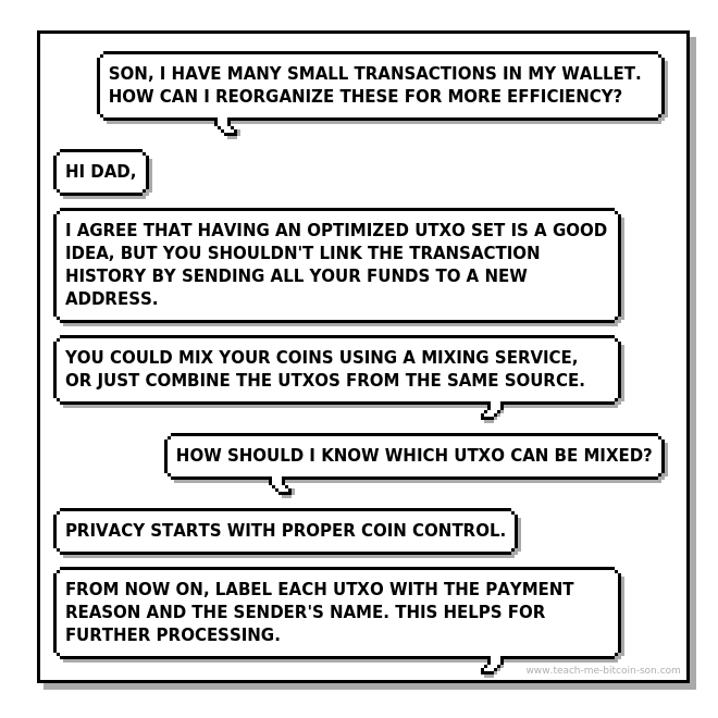 Dad: Son, I have many small transactions in my wallet. How can I reorganize these for more efficiency?