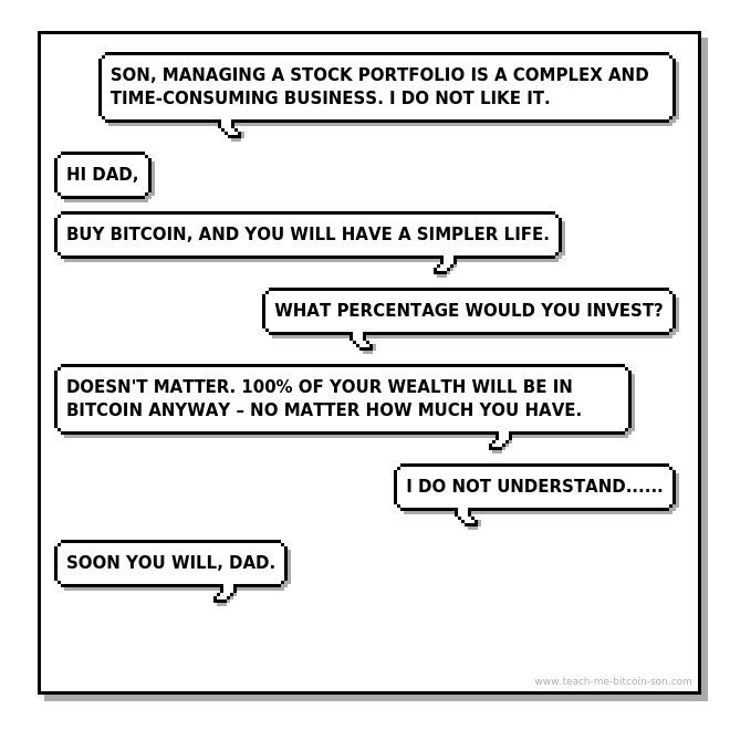 Son: Doesn't matter. 100% of your wealth will be in bitcoin anyway – no matter how much you have.