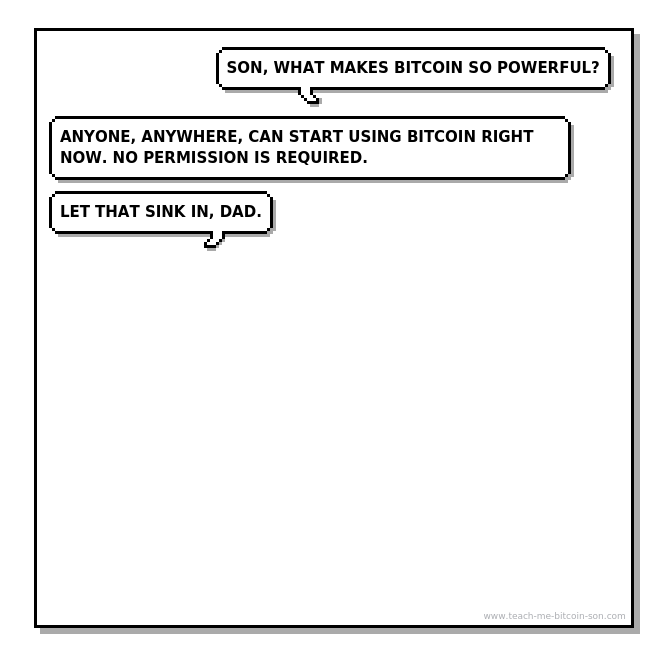 Son: Anyone, anywhere, can start using bitcoin right now. No permission is required.