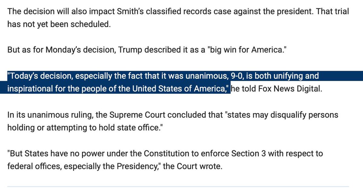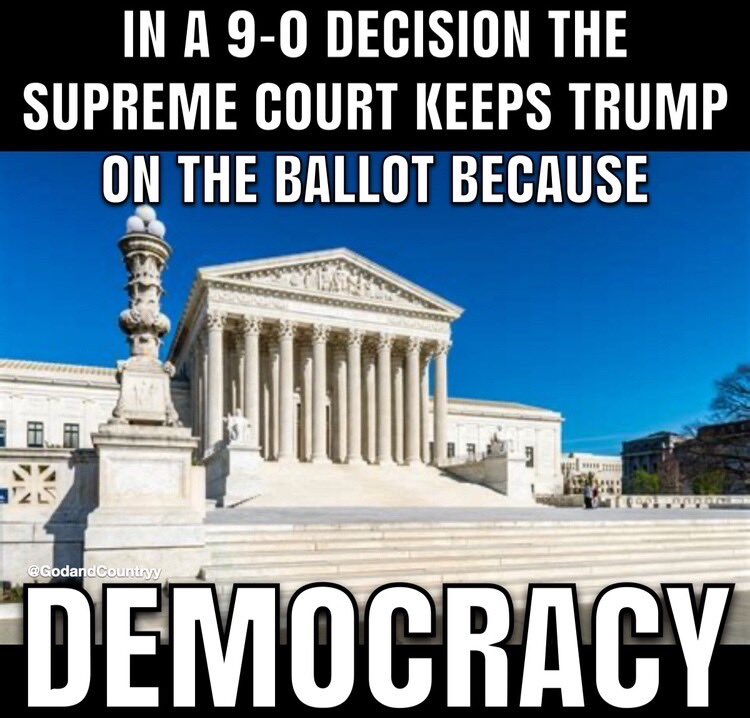💥今天早上的大好消息:最高法院以9:0投票结果通过推翻CO州移出川普的名字在2024大选选票上的法案。