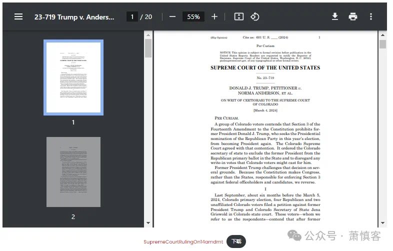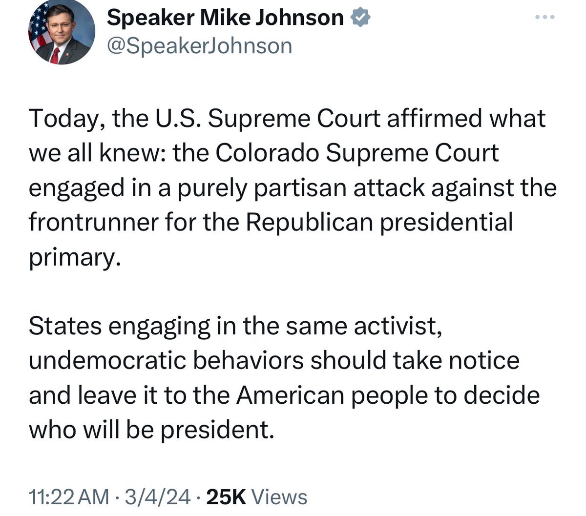 “美国最高法院证实了我们都知道的事实:科罗拉多州的高法院对共和党总统初选的领跑者进行了纯粹的党派攻击。