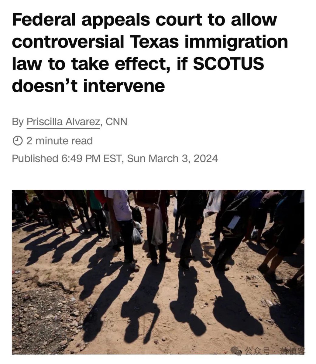今天,3月4日周一的上午就听到两个好消息,一个是最高法院推翻了科州第14修正案的决定,以9:0的一致使川普大胜;另一个是联邦法院批准德克萨斯州的新移民法,将允许德克萨斯州的新移民法SB4于3月9日生效。SB4允许德州当局逮捕和拘留任何越境的非法移民!该法允许德州绕过拜登的联邦,在德州或边境地区逮捕和详细审查非法移民。