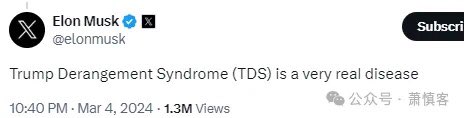 马斯克前天在X上写道:"盲反川普综合症”(TDS)是一种非常真实的疾病。”暗示马赫就是TDS的患者。