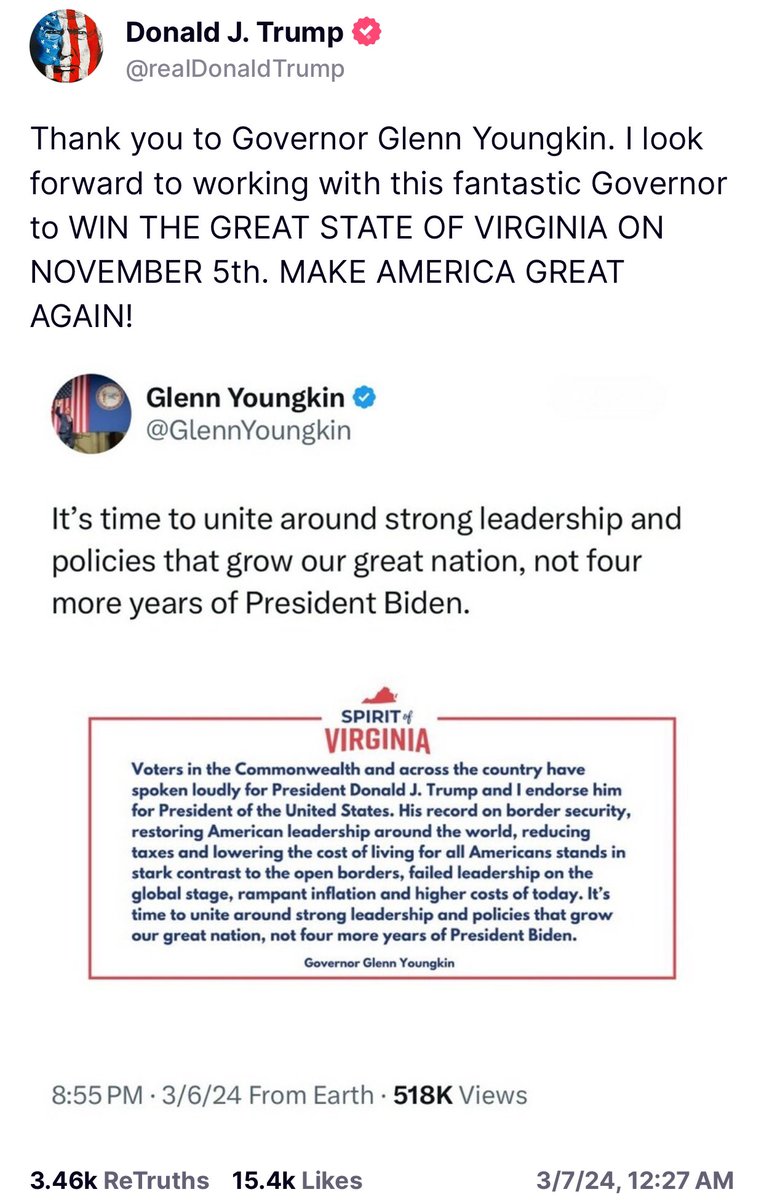 川普:感谢州长格伦.杨金。我期待着与这位出色的州长合作,在 11 月 5 日赢得弗吉尼亚州的胜利。让美国再次伟大!