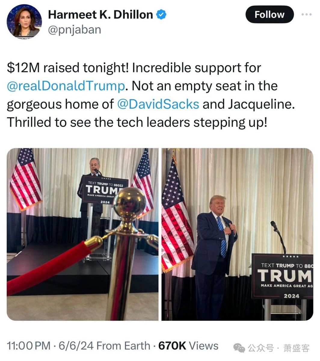 迪希隆的X文:今晚筹集了1200万美元!川普获得了令人难以置信的支持。萨克斯和杰奎琳的华丽家中座无虚席。很高兴看到科技领袖们挺身而出!
