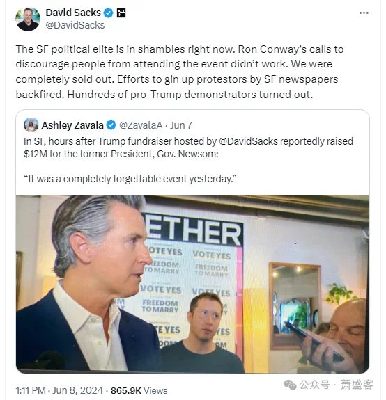 萨克斯在6月8日周六的X文中转评:旧金山的政治精英们现在是一盘散沙。罗恩.康威(美国的风险资本家和慈善家。他被描述为硅谷的“超级天使”之一)打电话劝阻人们不要参加活动,但没有奏效。我们的票完全售罄。旧金山报纸煽动抗议者示威者的努力适得其反。数百名支持川普的示威者出现了。