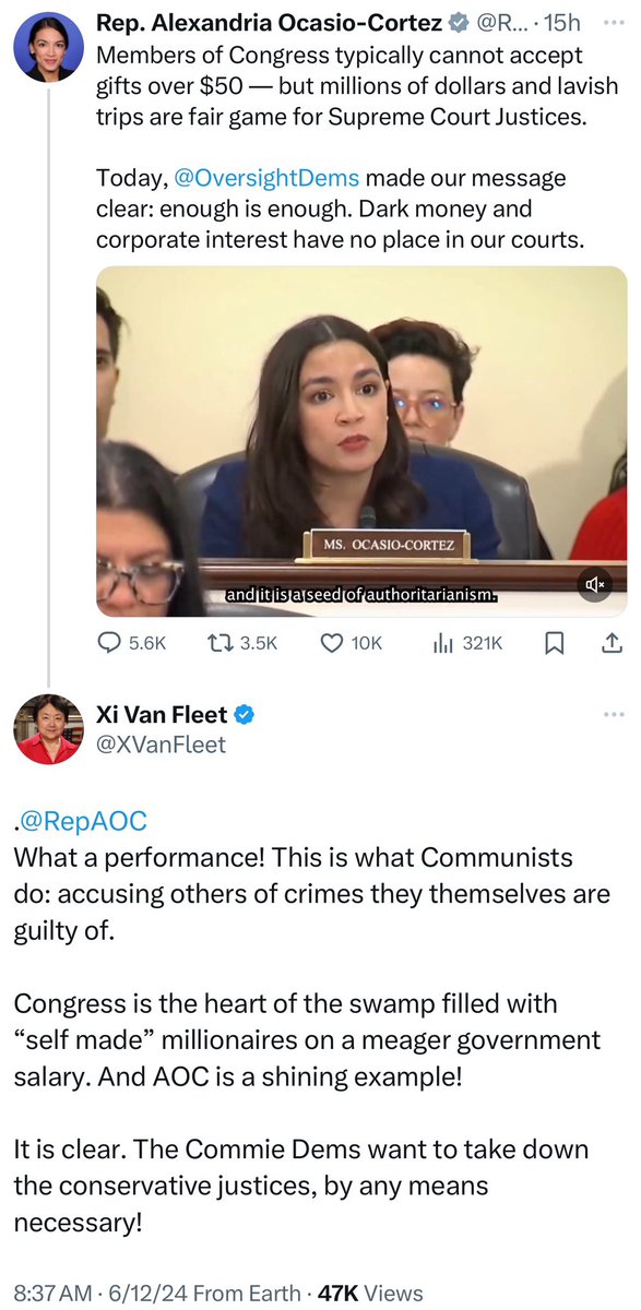 ⏺️AOC:国会议员通常不能接受超过 50 美元的礼物,但数百万美元的礼物和奢华的旅行对最高法院法官来说却是公平的(暗指最高法院大法官托马斯)。