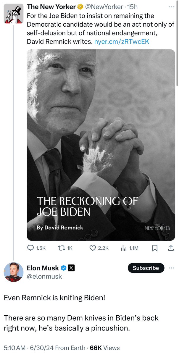 X文:大卫.雷姆尼克(David Remnick)写道:"如果拜登坚持继续作为民主党候选人,这不仅是一种自欺欺人的行为,更是一种危害国家的行为。