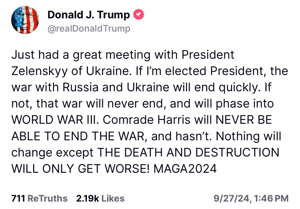 会晤之后,川普很快在TS上发布:刚刚与乌克兰总统泽连斯基进行了一次重要的会晤。如果我当选总统,俄罗斯和乌克兰的战争将很快结束。否则,战争将永远不会结束,并将演变为第三次世界大战。哈里斯同志将永远无法结束这场战争,而且也没有结束。除了死亡和破坏只会更糟之外,一切都不会改变!MAGA2024!