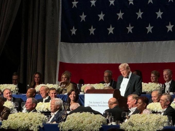 10月17日周四,川普出现在纽约市一年一度的阿尔·史密斯慈善晚宴(Al Smith Dinner)上。卡玛拉·哈里斯没有出席晚宴,她选择了参加竞选活动,而不是亲自参加这一天主教的慈善活动,她送来了一段预先录制的视频,引起了与会者的嘘声。