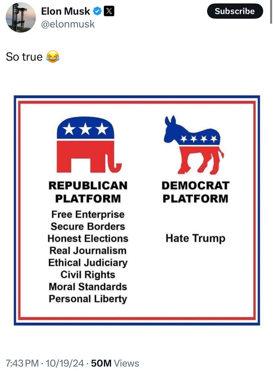 马斯克的回应:(共和党与民主党的平台对比)千真万确!图文内容:共和党:企业自主、安全边界、诚实选举、真正新闻、司法公正、民主权力、道德标准、个人自由。民主党:痛恨川普!