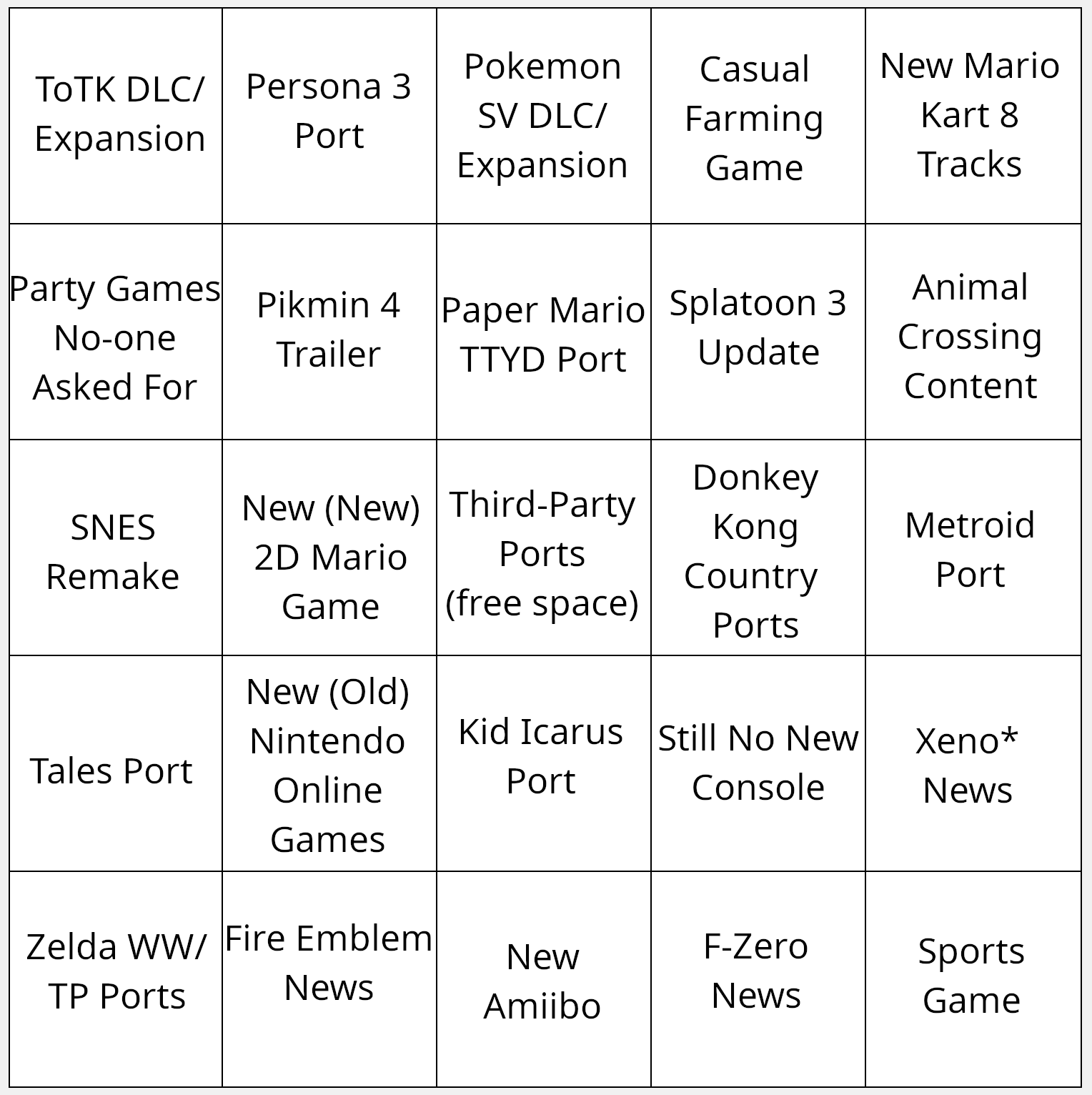 I’m gonna put together a new bingo card for the nintendo direct today. Let me know your picks. Here’s the one I had last time: