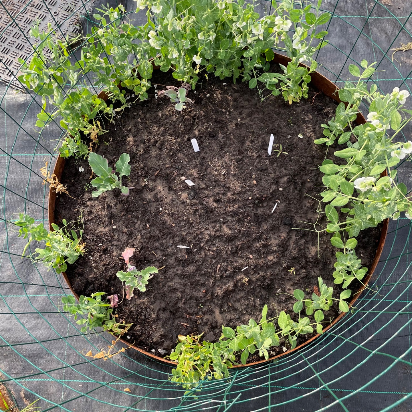 Similarly with the peas: 6-9 o’clock were lovingly nurtured from early March and planted out mid-April, 9-12 late March / mid-April, 12-3 were direct sown mid-April and 3-6 late May. What I’ve harvested so far were from the first two batches, but the first one in particular is never going to produce enough to justify the space / effort.