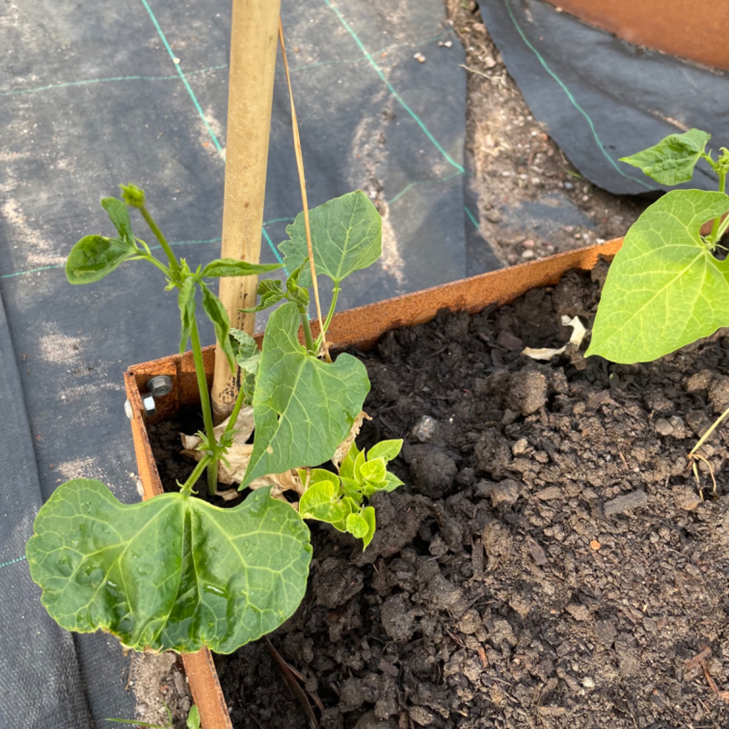 You can also see the difference between my indoor, lovingly tended, started-under-lights-at-the-start-of-April runner beans and the ones where I just plonked some seeds in at the same time as I planted them out. I think I’ll be direct sowing my rubber beans in future, here.