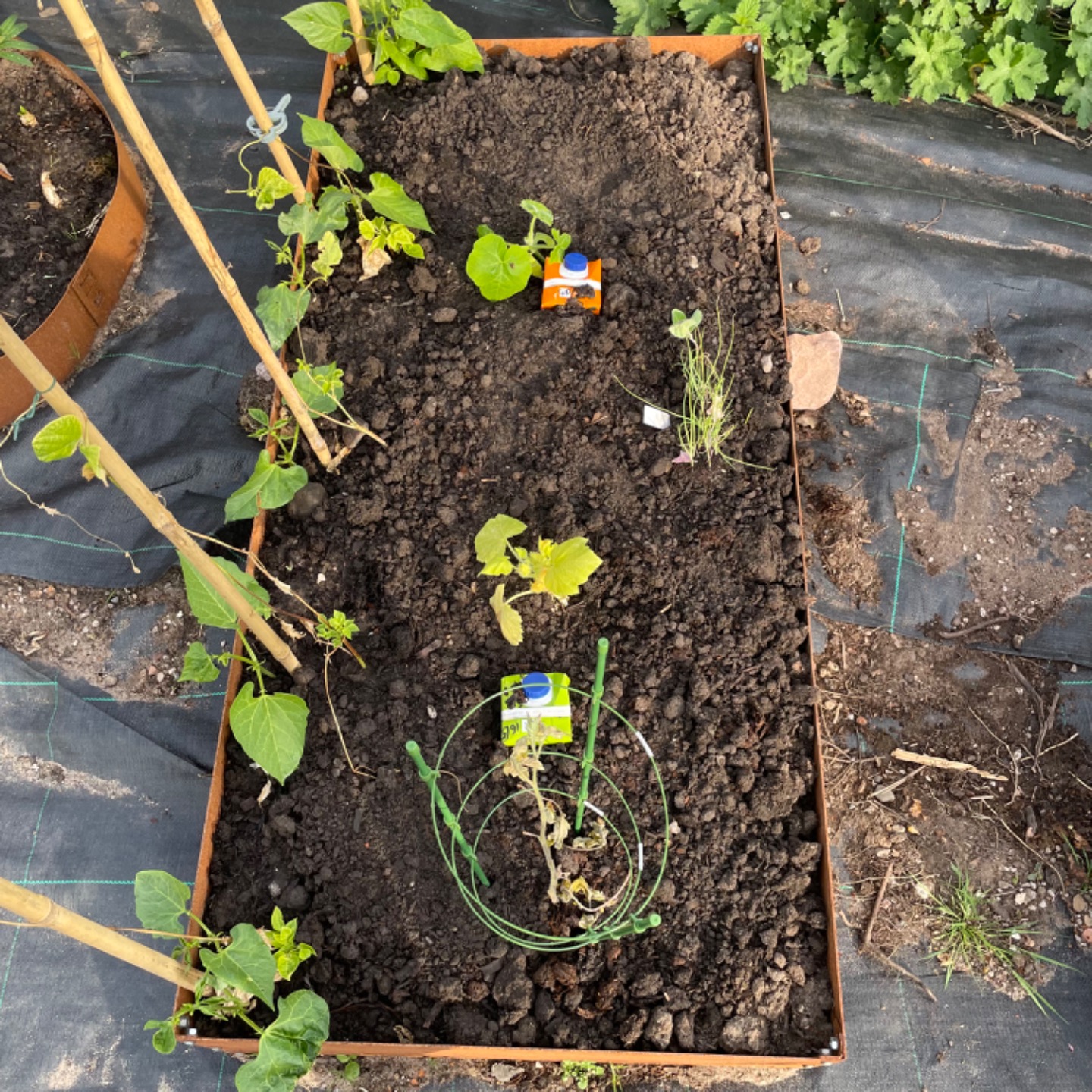 I’ve taken advantage of the change in the weather to plant out some squash plants, adding next to them a tetrapak with holes made in it along the side facing the plant, which supposedly makes deep watering easier.