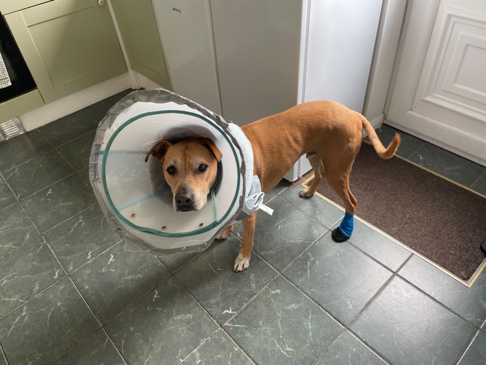 I thought I was really onto something with the towel/cone combo, but he developed a hint of a cough so I mixed that for general lying on the sofa. Ditto boot then he got the rubbed patch.