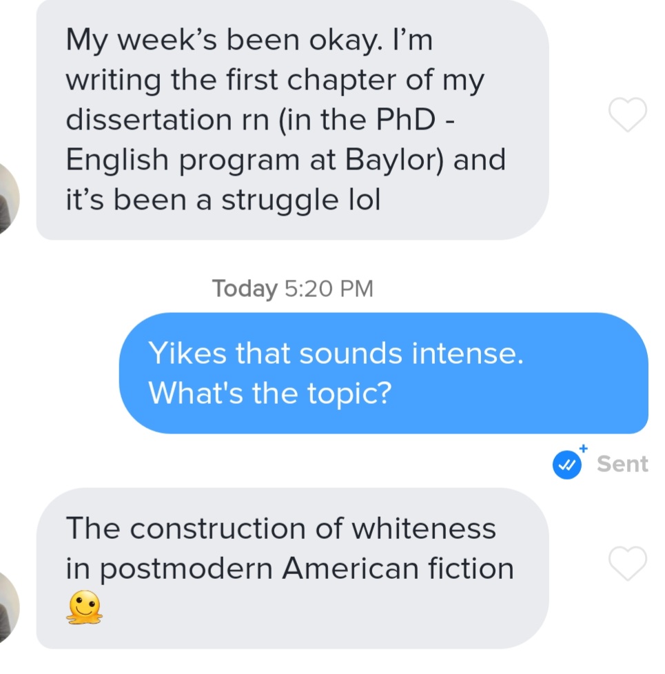 Construction of whiteness guy unmatched after moving to texting and Iβll tell ya that makes me suspicious.