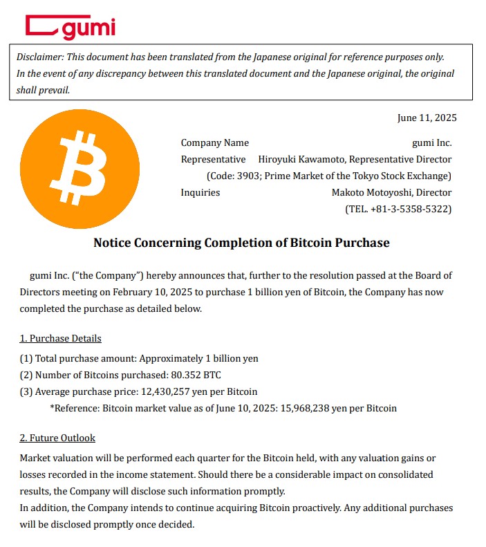 Japanese gaming giant Gumi just bought ¥1 billion worth of #Bitcoin
