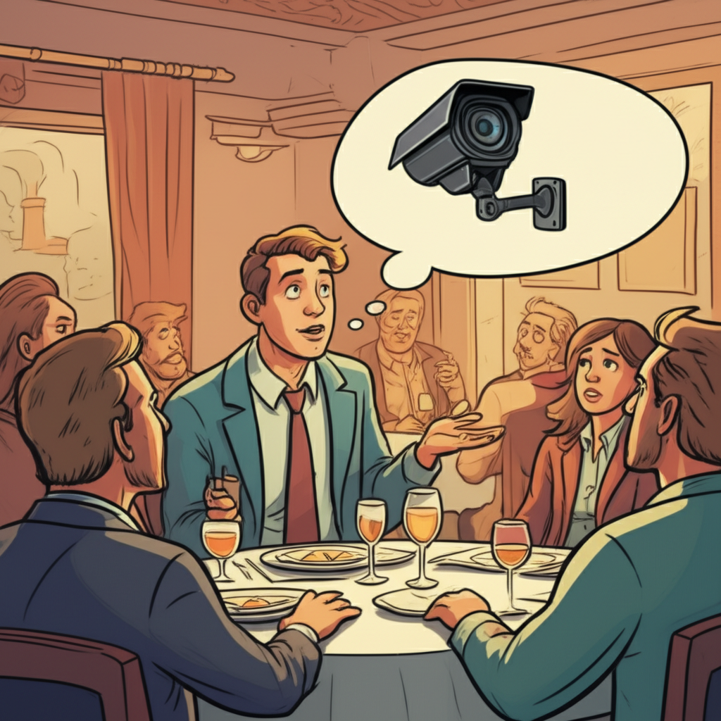 A programmer is at a fancy restaurant for a team meeting, when they realize they've been talking to a security camera the whole time.