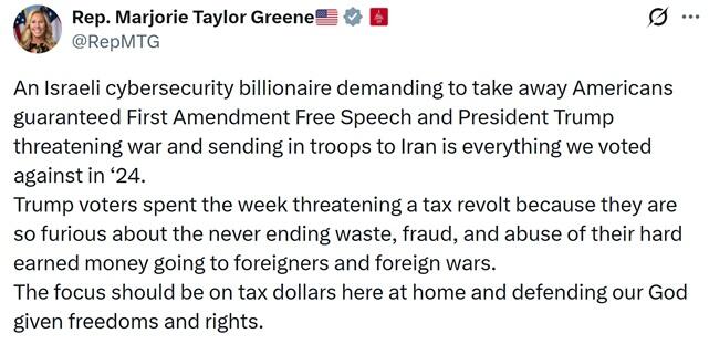 He said that second, "Military strikes on Iran require Congressional authorization." He followed with the final criticism of, "This threat isnât about freedom of speech in Iran; itâs about the dollar, oil, and Israel" - while reposting Trump's original message.