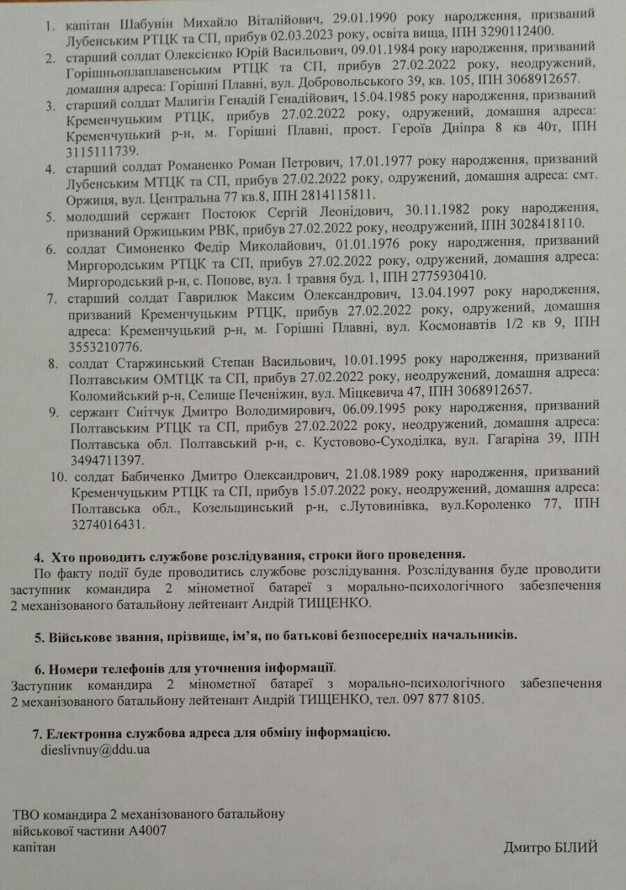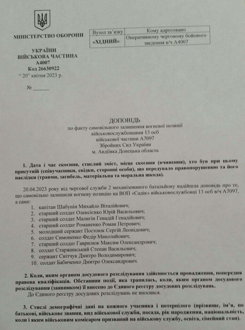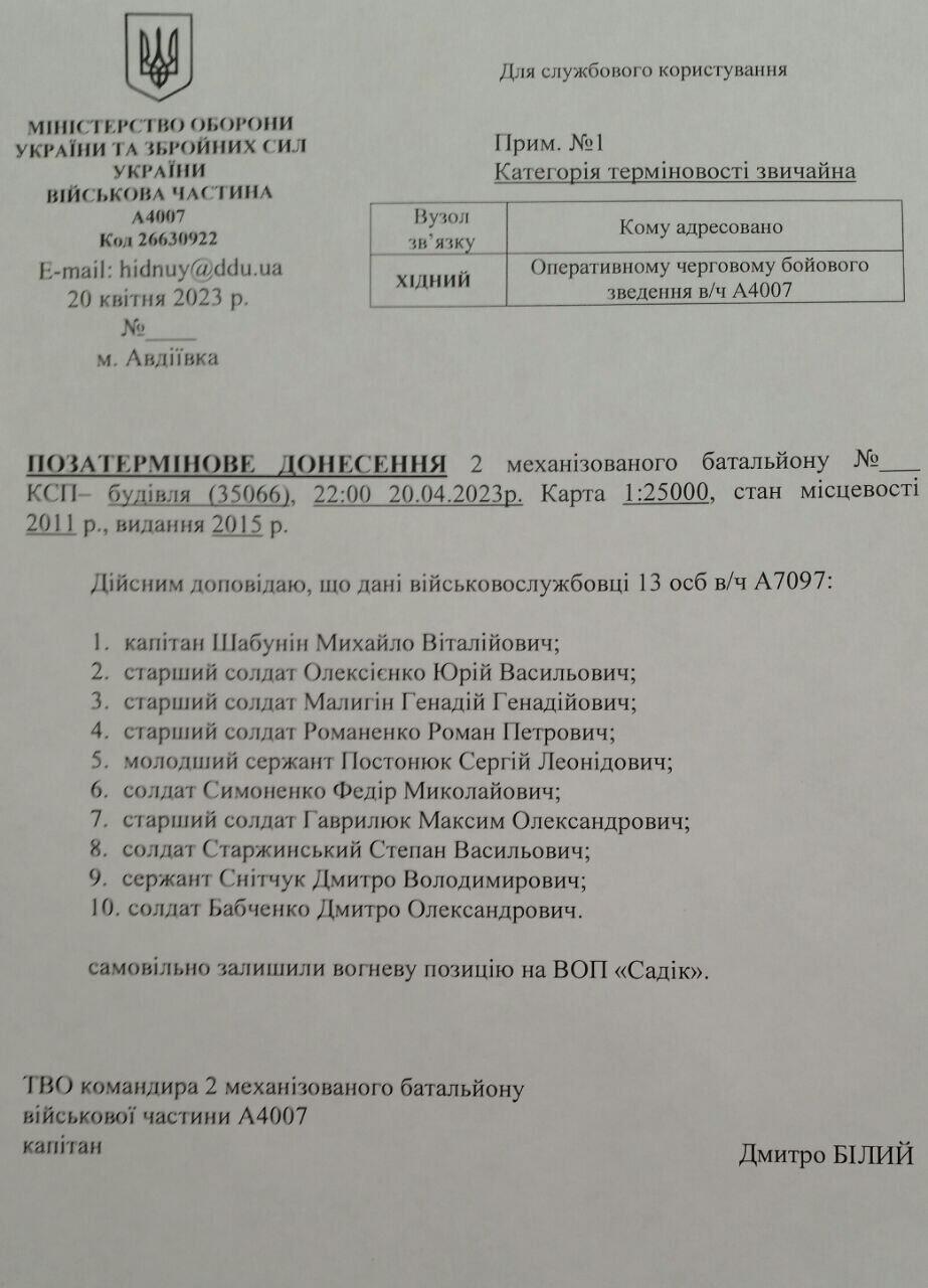 This is a list of soldiers from military unit A7097 who have voluntarily left a position called “Sadik”. Translation: the Ukrainians lost control over this strong point, Sadik, because of these guys. Among them there is a Captain, Mykhailo Shabunin.