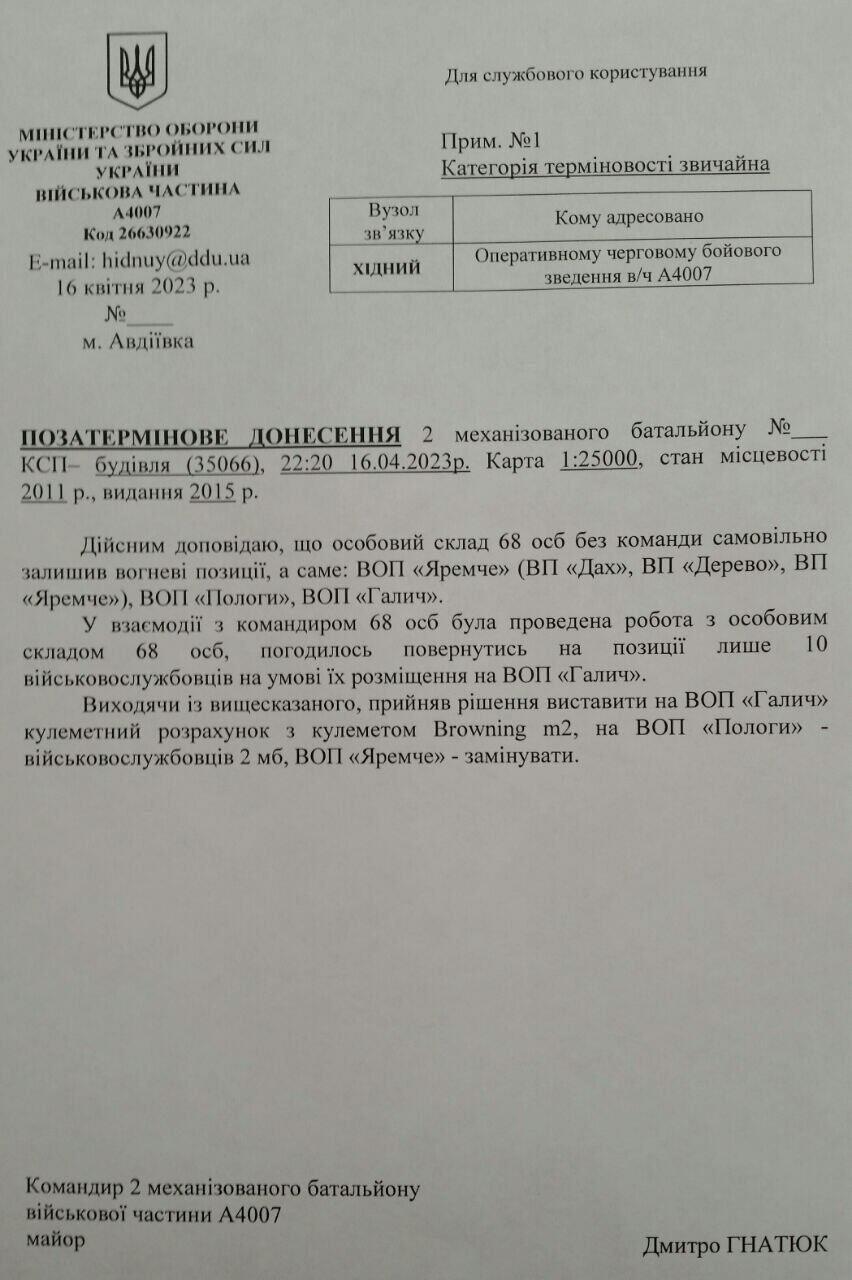 This is an urgent report by Major Dmytro Hnatyuk, commander of the 2nd batallion on massive “voluntary” withdrawing of firing positions Yaremche, Dakh, Derevo, Polohy, Halych.