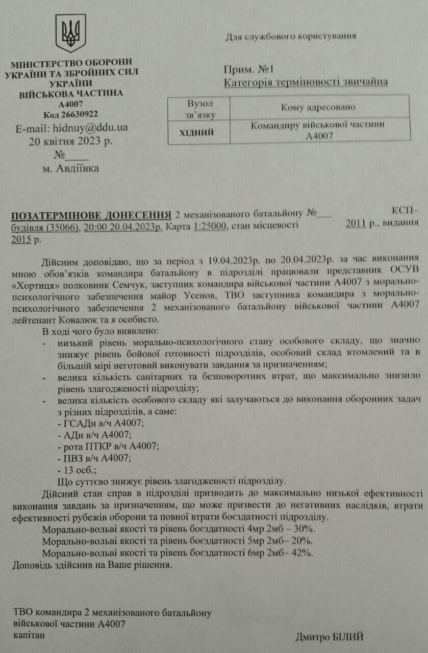 Bilyi says that between April 19 and 20, 2023, he as temporary acting commander as well as other officers have concluded that the 2nd battalion had reached critically low morale and psychological conditions.