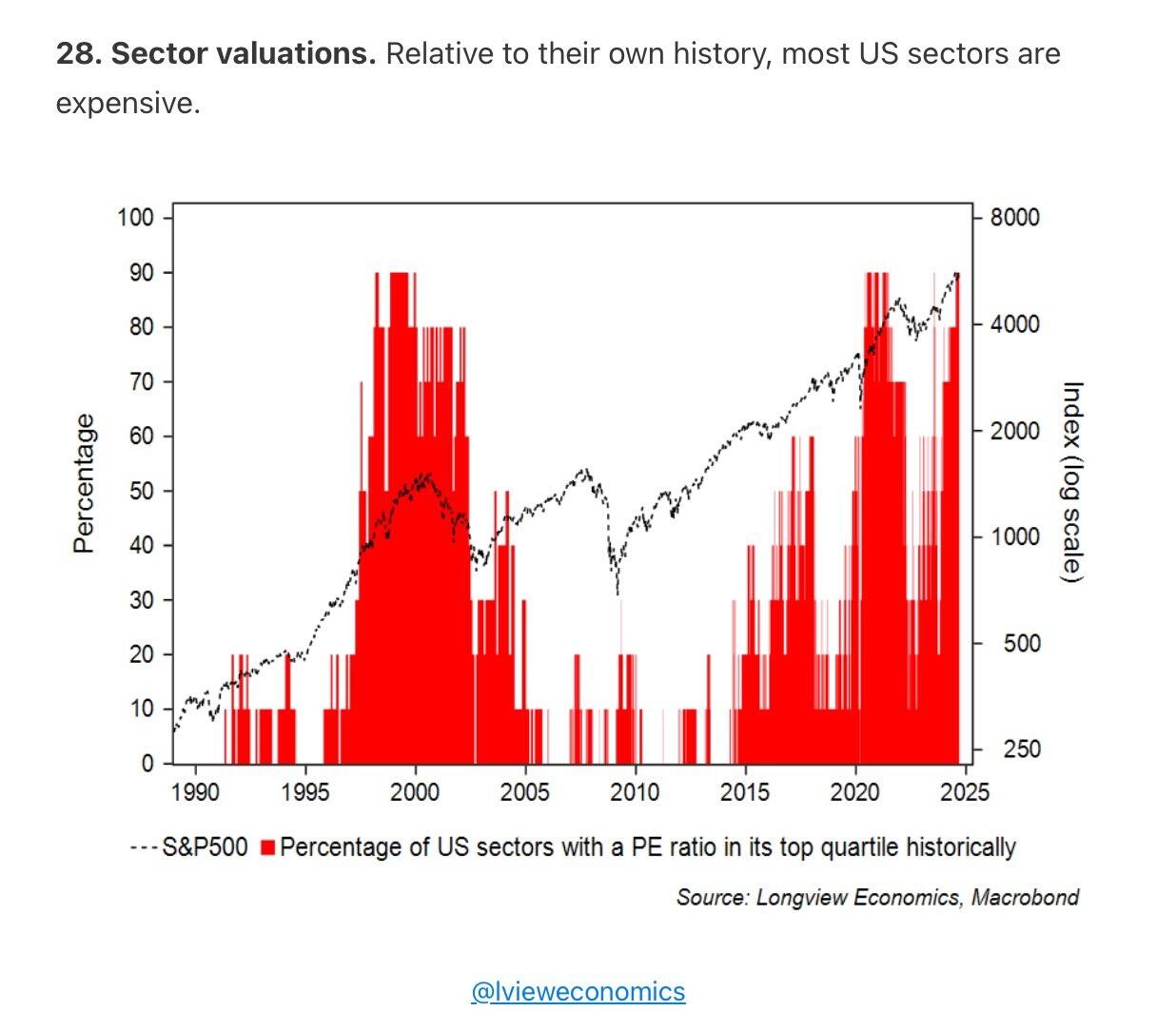 Stocks are still doing well, for now, but markets look expensive. The chart below, from Longview Economics, shows that 90% of U.S. stock sectors are in their top quartile (25%) of historical valuations.