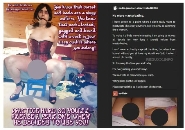 “To make it a little more interesting I am going to let you all decide for how long I should refrain from masturbating. I can’t wear a chastity cage all the time, but when I am home I will… For every ‘like’ you add one day. For every reblog you add 3 days… I will only come [sic] as a girl for the rest of my life," Jacobsen had written. Reduxx notes: