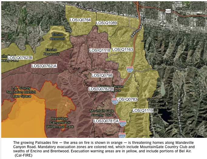 LA Times warned: "The Palisades fire can now be seen across Los Angeles' San Fernando Valley, an unsettling development as officials worried about the fire expanding into neighborhoods in Encino and Brentwood and possibly jumping the 405 freeway into Bel Air."