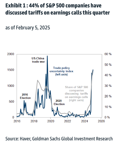 Trade war fears resulted in nearly half of all SP500 companies discussing tariffs during earnings calls. Tariff discussion is back to levels not seen since Trump's first term.