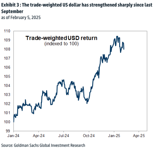 Companies grappled with a stronger US dollar during 4Q, as the trade-weighted US dollar strengthened by 6% during the quarter. The combination of strong US economic growth, solid US asset returns, and the threat of tariffs have supported dollar strength in the later part of 2024 and the beginning of this year (Exhibit 3).