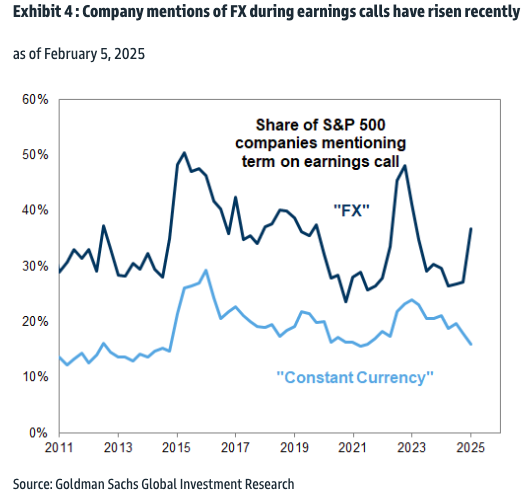 Goldman Sachs analysts highlighted three key themes emerging from this earnings season that are top of mind for corporate America: the impact of tariffs and an escalating trade war, the strength of the US dollar under the Trump administration, and the developments in artificial intelligence on their businesses.