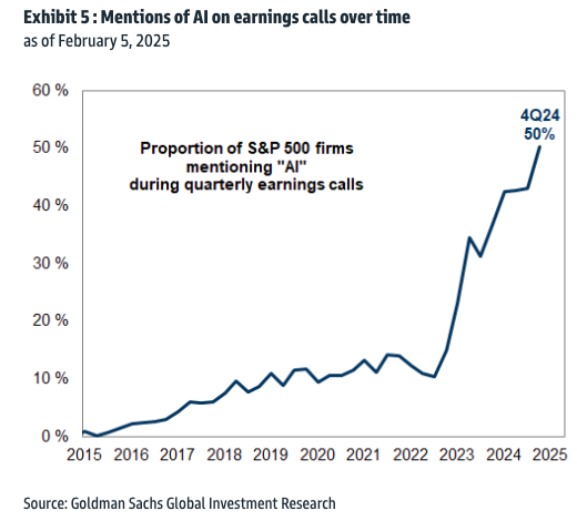 Managements continued to express enthusiasm over AI on 4Q earnings calls, with some noting that AI has led to improvements in efficiency internally and for their customer base (C, T, SLB, UNH). The share of companies mentioning AI during this quarter's earnings calls reached a new high at 50%. After last Monday's news about DeepSeek, commentary from mega-cap tech companies (GOOGL, MSFT, META) highlighted the potential benefits of recent developments in AI.