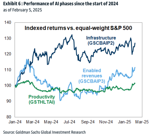 The AI trade has continued to broaden, particularly to companies with the potential to monetize AI and boost their earnings from widespread AI adoption. Since the start of Q4 earnings season, our basket of Phase 2 AI infrastructure stocks (GSCBAIP2) have outperformed the equal-weight S&P 500 by 2 pp, whereas stocks with AI enabled revenues (GSCBAIP3) have outperformed the equal-weight S&P 500 by 6 pp. Phase 3 companies (e.g. ACN, ADBE, META) are starting to capitalize off their AI investments, deploying tools internally and into their products, allowing employees and customers to benefit.