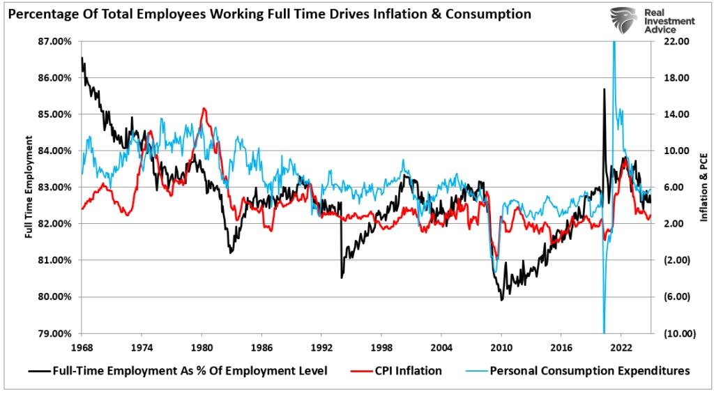 As noted above, employment is required to create consumption and increase economic activity. Crucially, “full-time” employment is required to create stronger economic growth rates, providing higher incomes, benefits, and household stability. Notably, peaks in full-time employment relative to the total number of employed civilians have correlated with weaker future economic outcomes and disinflationary impacts. (The only exception was 2020, as mass employment terminations created a temporary bump in full-time employment.)