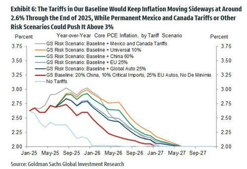Goldman's rule of thumb is that every 1% increase in the effective tariff rate raises the core PCE price level by 0.1%, the bank now estimates that tariffs will provide a one-time boost to year-on-year core PCE inflation of 0.5% (vs. 0.3% previously), leaving it at 2.6% in December.