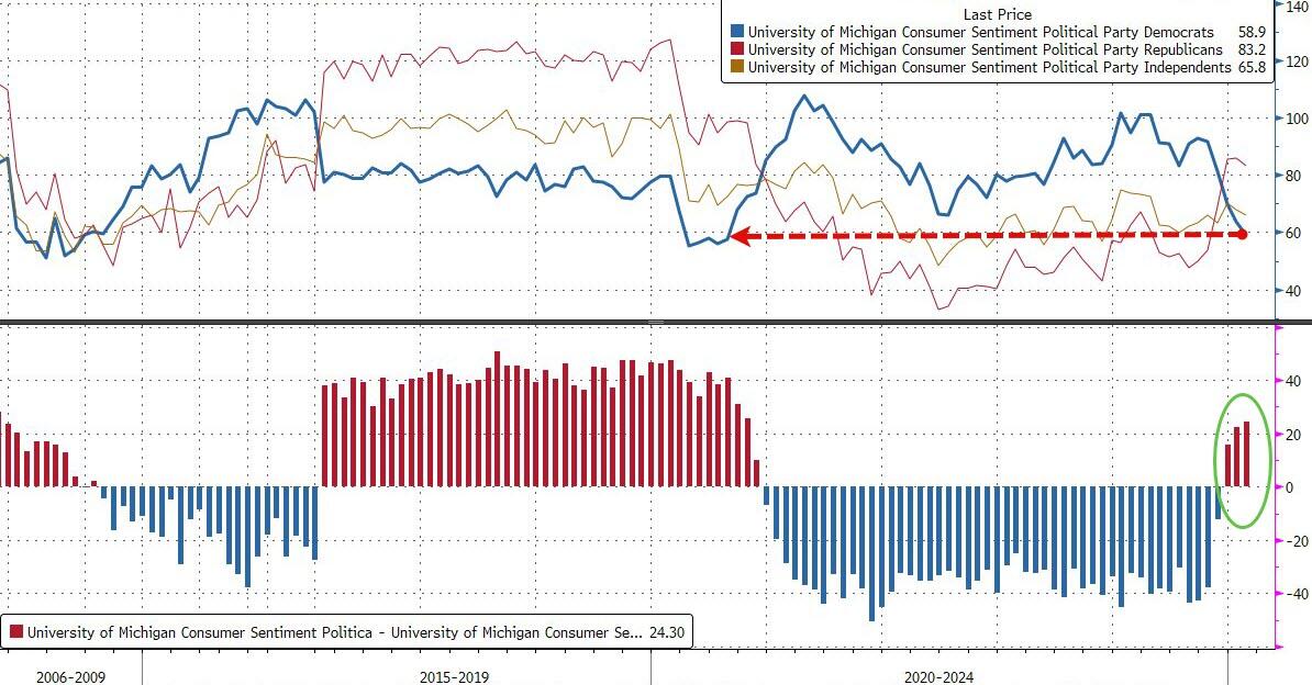 Finally, the slump in broad sentiment seems driven by partisan politics of course with Democrats' now at their least confident since Aug 2020...