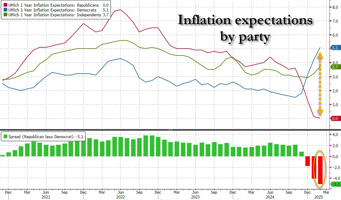 Most notably, the surge in inflation expectations was due entirely to Democrats (we guess they've been reading Politico's 'tariff tax' fearmongering too much?)...