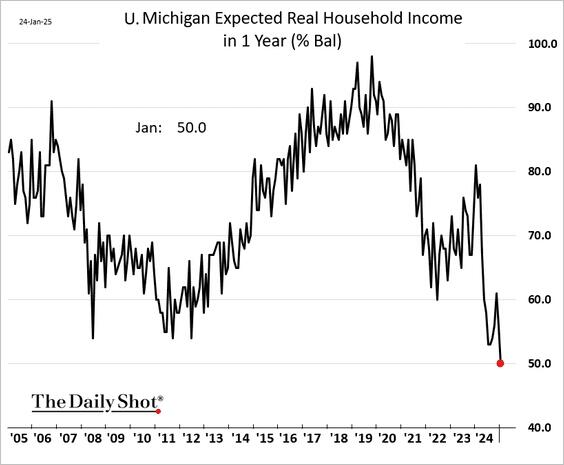 Expectations for personal finances sank about 6% from last month, again seen across all political affiliations, reaching its lowest value since October 2023.