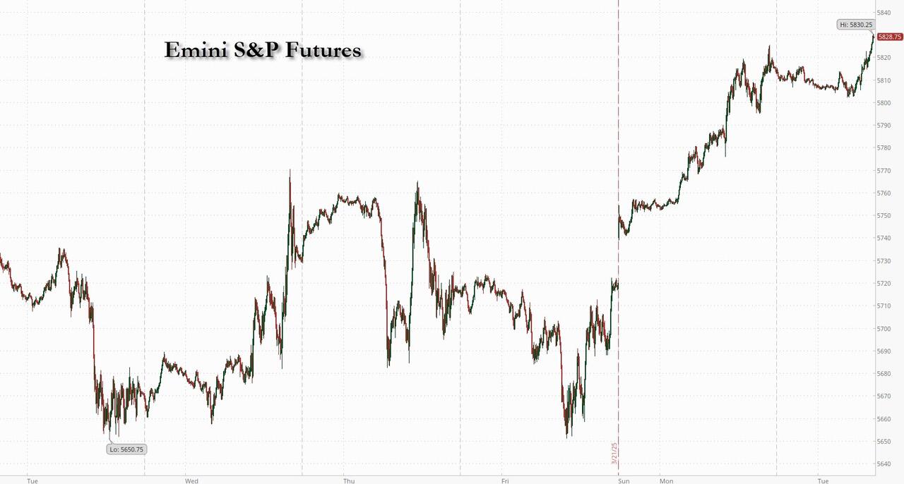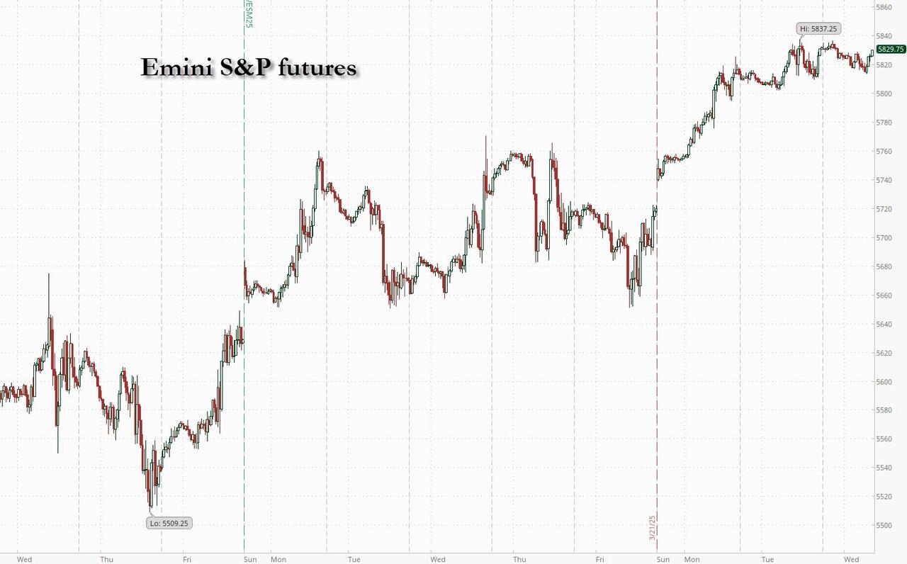 US equity futures are flat, reversing earlier losses while global markets were mixed (Europe down, Asia up) as investors awaited more clarity on US tariff plans and the economic outlook before Donald Trump’s April 2 "Liberation Day" deadline to impose a fresh reciprocal tariffs. As of 8:00am ET, S&P futures were up 0.1% following modest gains on the indexes on Tuesday, while Nasdaq futures were flat as Tesla and Nvidia shares edged lower, pressuring the Mag 7. Europe’s Stoxx 600 index dropped 0.5%. Bond yields are 1-3bp higher and USD is higher. Commodities are mostly higher led by oil and base metals. Copper futures in New York surged to a record high (up 1% now after easing off records) as traders priced in the possibility of hefty import tariffs that may come within several weeks. Headlines were mostly quiet since market close yesterday. Today's economic calendar includes Feb durable goods orders at 8:30am; Fed speaker slate includes Kashkari (10am) and Musalem (1:10pm).