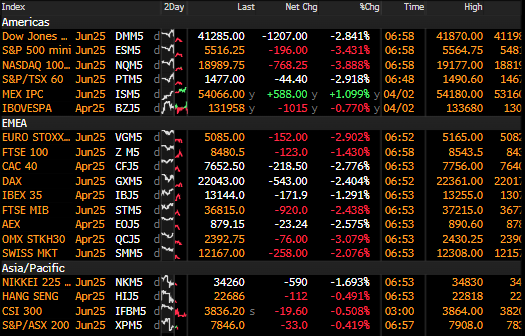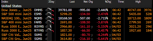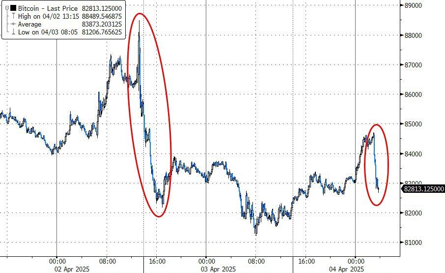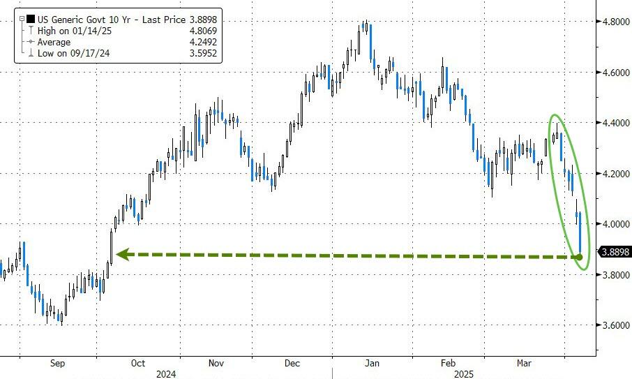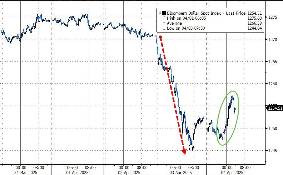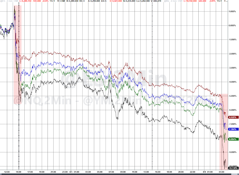 U.S. equity futures took another leg lower, the VIX spiked to 36, Treasury yields slipped (UST10Y <4%), crypto tumbled, and the dollar reversed its European session gains—just after 06:00 ET—when China hit back at President Trump's "Liberation Day" tariff blitz.