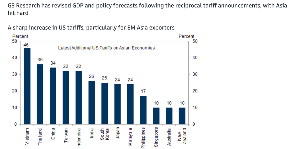 Yet TTT is above all a trade war on Asia. “Reciprocal” tariffs – not exactly reciprocal – were imposed on China (34%),Vietnam (46%), India (26%), Indonesia (32%), Cambodia (49%), Malaysia (24%), South Korea (25%), Thailand (36%), earthquake-hit Myanmar (44%), Taiwan (32%) and Japan (24%).