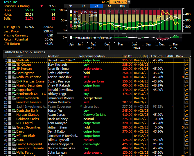 As of the latest Wall Street consensus (data via Bloomberg), 55% of analysts covering Tesla maintain a "Buy" rating, 23.3% rate the stock as "Hold," and 21.7% assign a "Sell" rating.