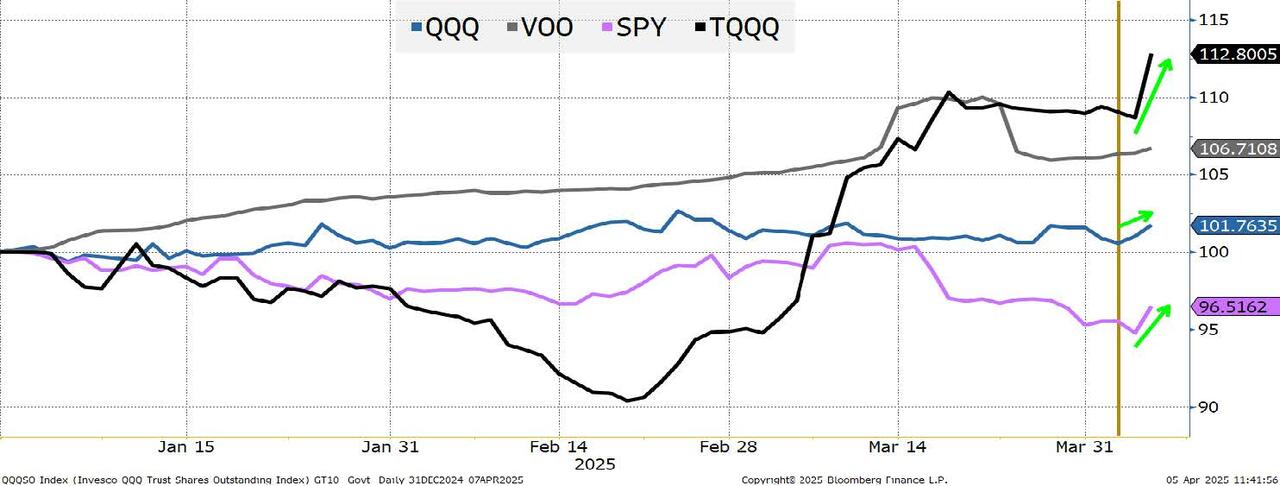US equity futures plunged early on Monday, with the S&P 500 teetering on the edge of a bear market. The sell-off comes in the wake of President Trump's "Liberation Day" tariff blitz, which aimed to reshape global trade in accordance with his 'America First' doctrine. Market tremors are already rippling through individual names —Tesla tumbled another 5% in premarket trading in New York, compounding Friday's brutal 10.5% decline.